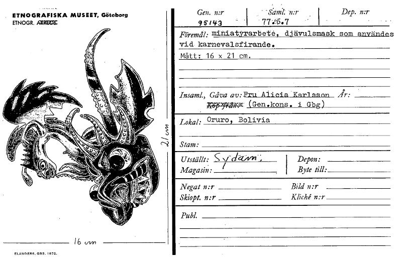 • ETNOGRAFISKA MUSEET, Göteborg ETNOGR. Al= /6 VVY7 ELANDERS. GBB. 1972. Gen. n:r I 96-143 - - $et. ml: 71:r . I - 77-4.7i Dep. n:r Föremål.. miniatyrarbete, djävulsmask som anvä.ndei vid. karn.evalsfiran.de. Mått.:' 16 x 21 cm. insam1., Gåva av:Fru Al ini a Ka.-rl ss nn fr • Ki~c: (Gen.kons. i Gbg ) Lokal: °11-1-r°7 Bolivia Stam• Utställt: S y-däml'. Depon: Byte till: Magasin. • i . Negat n:r Bild n:r Klichl• n•r Skiopt. n:r Publ. [ocr]Stäng