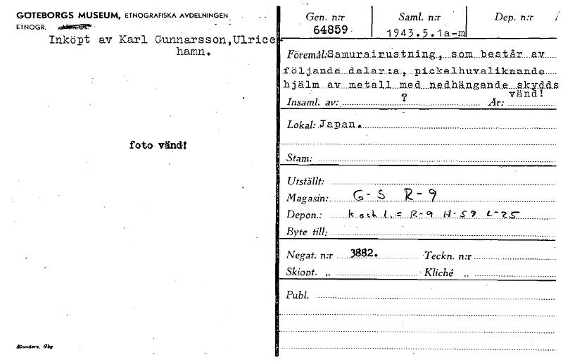 foto- vänd! Masas..., Abe GOTEBORGS MUSEUM, ETNOGRAFISKA AVDELNINGEN ET N OGR. ~ge Inköpt av Karl Gunnarsson,Ulrice hamn. Gen. n:r 64859 . : . Saml. n:r 1943.5.1a-ra Dep. n:r , FöremåhSamur.a.i.r.Ustning..,....s.oxa...b.e.s.t.år. B.V i .f.ö.l.j.andå...d.e.l.air.:.a.,...pick.e.lihuvalikriandie ',:.h.jälm.....a.v...xaetz.1.1...m.e.d....ne.d.hängand.e....s.k.y.d.d.f ? vänd! ' Insaml. av: .År: _ Lo...