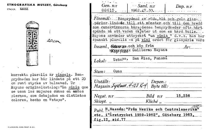ETNOGRAFISKA MUSEET, Göteborg ETNOGR. YNEKM korrekta pluralis år winmala. Ben- prydnaden har här lindats på ett 20 cm runt stycke bV balsaved. Ur Hayans originalkatalog:"Un winis que se usan las mujeres cunas en ambas oiernas, som debujados en distintos colores, hecho en Ustuoo". ELANDERS. GBG. 56E17. 8. 61. Gett n:r 88615. ._ .- Samt. n:r 1962.47.33. ,--. Dep. n:r --- -- - , _ ._ _Föremål:- Benpr...