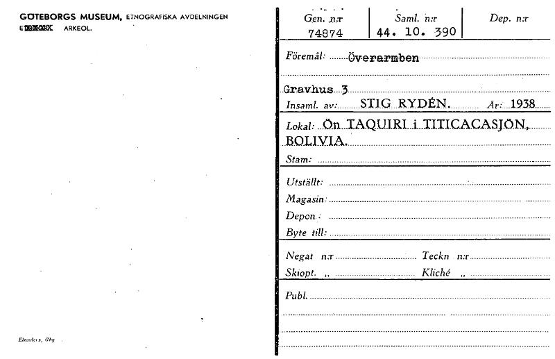 • GOTEBORGS MUSEUM, ETNOGRAFISKA AVDELNINGEN EDOMEK ARKEOL. Elandr, s, Gby . G.e.n. .n.:r 74874 .5. aml. n:r i 44. 10. 3.90 Dep. mr Föremå/: Överarmben .Grav_hus 3 Insaml. av: STIG .RYDEN. Ar:- 1938 Lokal: „On_TAQUIRLI_TITICACASJON., _BOLIVIA. stam: utstailt: Magasin: Depon.: Byte till: Ålegat n:r Teckn n:r Skiopt. „ Kliche „ Publ. [ocr]