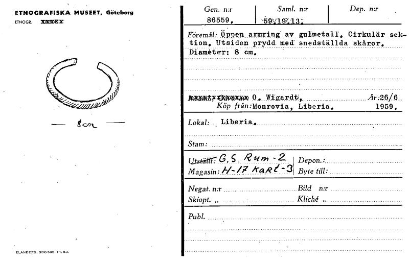 ETNOGRAFISKA MUSEET, Göteborg ETNOGR. XLKX Gen. n:r 86559, Saml. `59':197;13: Dep. n:r Föremål: Öppen armring av gulmetall. Cirkulär s.ek- -bion. Utsidan prydd. med snedställda skåror. Diameter: 8 cm, ge/7‘.._ IfläMlqc¥34W2Fin 0, Wigardtt Ar:2.6/.6... Köp från:Monrovia, Liberia, 1959, Lokal:.. Liberia, Stam: UNS gitr G, 9 . R tim -2 Magasin:///? A-4 g e-3 Depon..: Byte till: Negat. n:r Bild n:...
