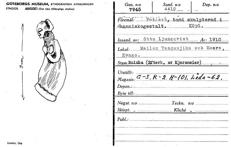 GOTEBORGS MUSEUM, ETNOGRAFISKA AVDELNINGEN E TNOGR. AR1E0.0. (Det Icke tillämpliga strykas) Elanders, Gbg Gen. n:o 7945 Sam!. mo i 4 4 lo - Dep. mo .E'äre-m--år:-"" - ::E'R'äji.l.e..fli. .tilid.. skalp.t.arad. I ..Kinänniskoge.stalt. - • • Köpt . Insaml. av: Otto,Ljungovist År •.1.910 Lokal: Mellan Tanganjika och Måero.1.• Kongo, Stam:BPalt.4.. (.gterb....av .Kj.er Me" lex) Utställt: i ,, M...