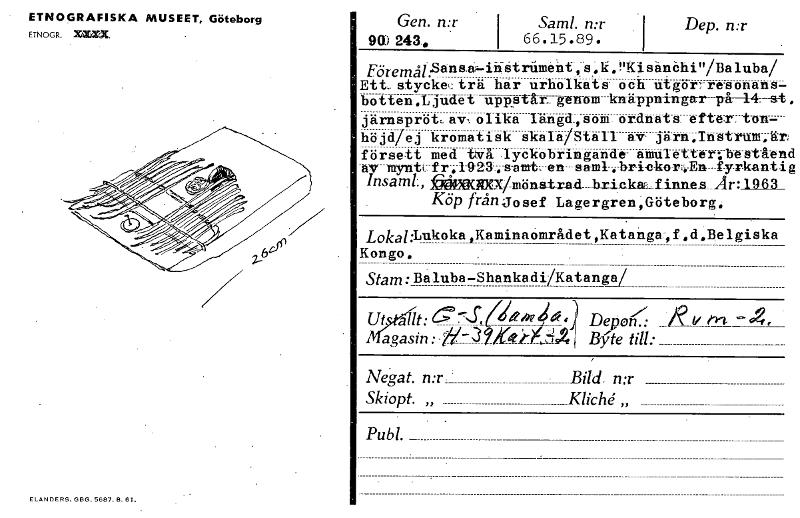 ETNOGRAFISKA MUSEET, Göteborg ETNOGR. =ra. Gen. mrSamd. I Dep. n:r I 90)243. 66.15.89. Föremål.sansa' ihstrUment,s,k."Kisitnehi" Baluba/ Ett. styekeArä har urholkats och utgor-resonans- botten.Ljudet-uppstår.. genom knäppningar -på- järnspröt,av,olika Iängd,som ordnats efter ton- höjd ej kromatisk skala Stall av järn,Instrum.lir försett med terå lyckobringande amuletter;bestAtnd wv myntlfr,1923,e...