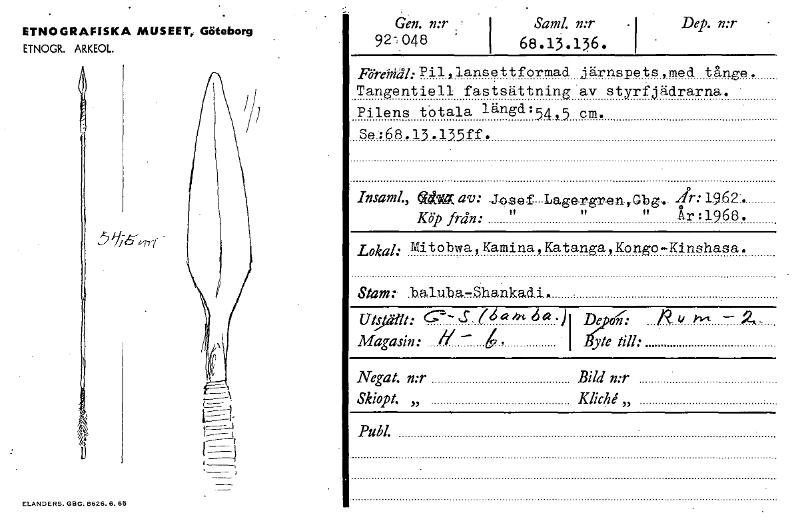 ETNOGRAFISKA MUSEET,. Göteborg ETNOGR. ARKEOL. Gen. n:r Sam?. n:r•I Dep. n:r 92",.048 68.13.136. i Före ål: Pil,lansettformad järnspets , med tånge. Tangentiell fastsättning av styrfjädrarna. Pilens totala längd:54,5 cm. Se::68.13.135ff. hisand., «zttZ4C av: Josef Lagergren .Gbg.. 19621. Is År:1968. t1 " Köp från: Lokal: Mitobwa,Kamina,Katanga,Kongo-Kinshasa. Stam: baluba-Shankacli. Magasin: Al ...