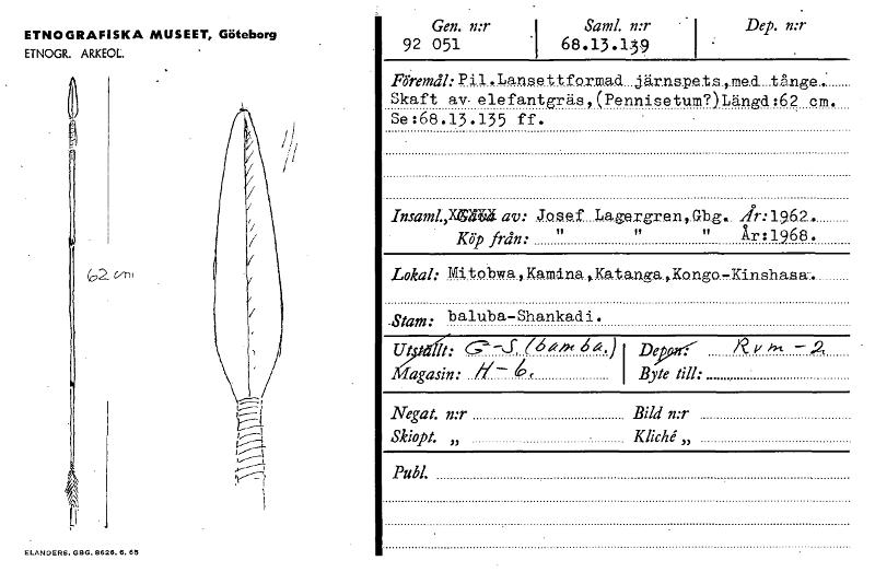 • ETNOGRAFISKA MUSEET, Göteborg ETNOGR. ARKEOL. Gen. n:r 92 051 Sam!. n:r I Dep. n:r .1 68.13.139 I Föremål: Pil .Lansettformad järnspets , me.d tånge; Skaft av- elefantgräs (Pennisetum?)Längd :62 cm. Se:68.13.135 ff. Insaml.,152fiä av: Josef IJagargren,Gbg. År:1962. " År:1968. Lokal: Mitobwa ,Kamd.na ,.Katangsa ,Kongo-Kin.shasa-.. Ut It: Mgm.64.)1 De n i --2 agasin: #— 6, I Byte till: Negat. n:r... Visa hela