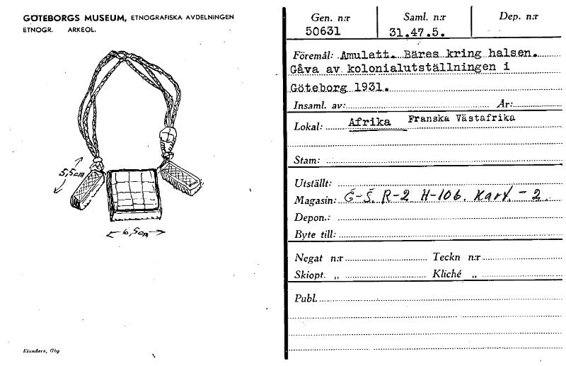 GÖTEBORGS MUSEUM, ETNOGRAFISKA AVDELNINGEN ETNOGR. ARKEOL. Ehmders,Gbg - Gen. n:r 50631 Saml. n:r 31.47.5. Dep. n:r - • Föremål: .Amulatt......Bäres....kring..halsen. Gåva av. kolonial-u.tställningen i .Göte.b.org...1.9.3.1.. Insaml. av: Är• Lokal: Afrika Franska Västafrika Stam: Utställt: Magasin: fi-o, h' /t 4 , KA .0- 2 , • Depon.: Byte till: Ålegat n:r Teckn n:r Skiopt. , Kliché. , Publ. . [ocr]
