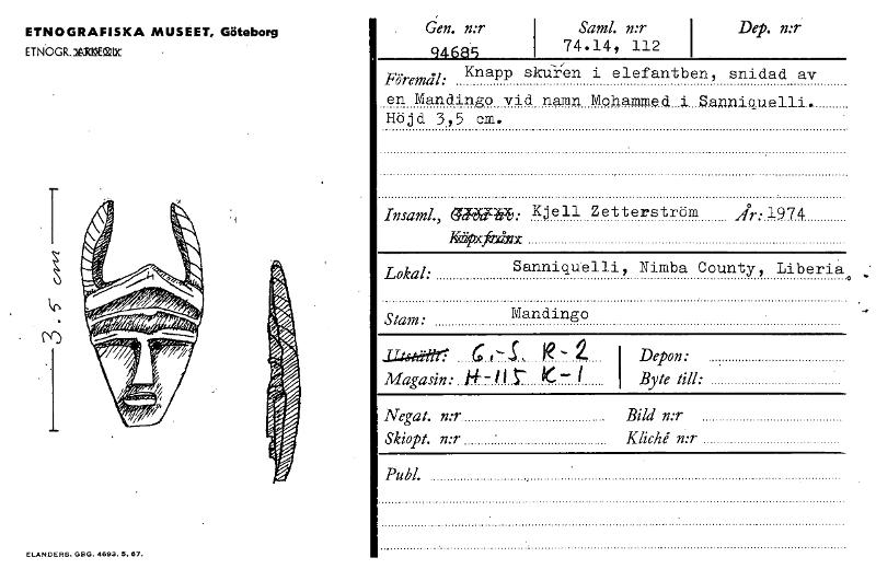 ETNOGRAFISKA MUSEET, Göteborg ETNOGR.3MECRr Gen. MT Saud. MT Dep. Mr. 94685 1 74.14, 112 Föremål: Knapp skåren i elefantben, snidad av en Mandingo vid namn Mohamed. j, anniquelli. Höjd 3.,5 cm. Insaml, ~19in Kjell Zetterström Iiiipxyfahnt Sanniquelli, Nimba County, Liberian Mandingo lumityr 6.., , - 2. Depon: Magasin: r Byte till: Negat. n:r Bild n:r Skiopt. n:r Kliché n:r Publ. Lokal: Stam...