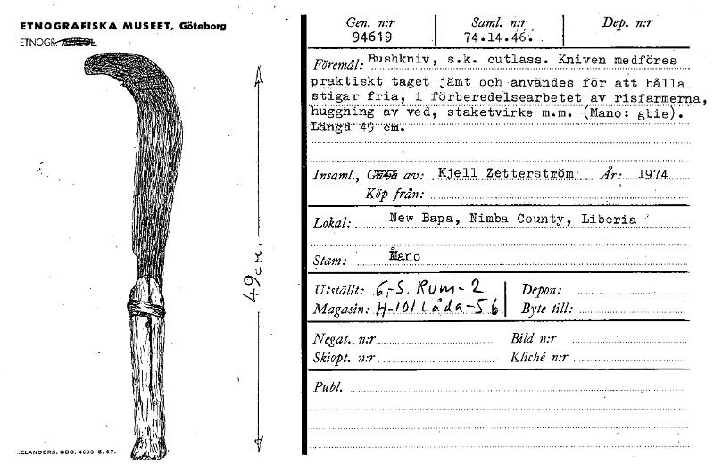 ETNOGRAFISKA MUSEET, Göteborg UNOW4-135555 Gen. n:r 94619 Saml. n:r 74.'14 . 46 : . Dep. n:r -ELANDERS. GBG. 4693. 5. 67. Föremål: Bushkniv s.k. cutlass . Kniven medföres praktiskt tåget jämt och anYänd.e.e. fi5r .att . hålla stigar fria, i förberedelsearbetet av risfarmerna, huggning av ved, staketvirke m.m. (Mario : gbie). Längd- 49 em. Gff29 av: Kjell Zetterström' : 1974 Köp från: Lokal: New Bapa, Nimba County, Liberia Ian Stam: ° Utställt: 67,- u ►vi -i Depon : Magasin: ji -I °\ L; ,I Byte till: N egat. . n:r Bild n:r Skiopt. n:r Kliché n:r Publ. [ocr]