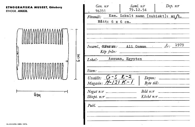 • ETNOGRAFISKA MUSEET, Göteborg ETNOGR. ARKEOL I if 1/4-9 511 JIL ELANDERS,G138.1972. GeMMT , 96351 . I 4:71:2N4 Dep. MT i Föremål: Kam. Lokalt namn (nubiskt): mip. Mått: 6 x 6 cm. hmaml., GÅWX=2: År Osman jr . 1979 Köp från: Lokal: 'Assuan, Egypten Stam- Utställt: G-S r--.2 i Depon: Byte till: Magasin• /74- l 3 I K- / Negat n:r Bild n:r Klich-e' n:r Skiopt. n:r Publ. kn‘i [ocr]