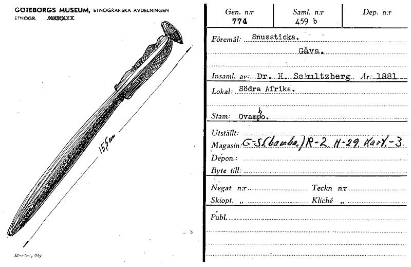 • GÖTEBORGS MUSEUM, ETNOGRAFISKA AVDELNINGEN ETNOGR. ytfaMVX Gen. n:r 774 Sam!. n:r 459 b Dep. n:r Föremål: Snussticka GåIra. . . Insaml. av:....Dr.....11.....S.elmil tzberg.. Ar:....18.81.. Lokal: Södra Afrika. b Stam: ..Ovanario . Ut ställt Magasin:G-j 4'4 —2 , /1-.2 i da - 3. De•Pon.: Byte till: . Negat n:r Teckn n:r Skiopt. „ Kliché „ Publ.. . ' [ocr]