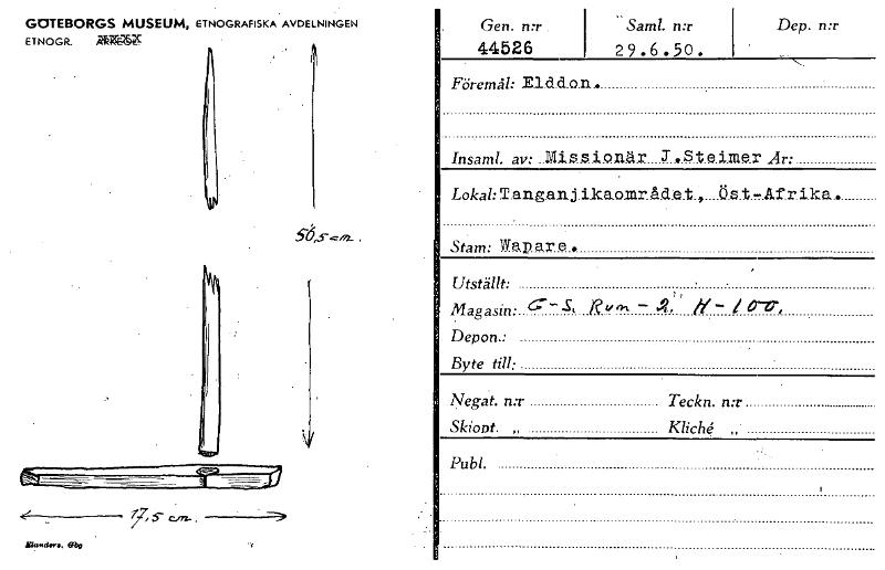 • GOTEBORGS MUSEUM, ETNOGRAFISKA AVDELNINGEN ETNOGR. AUPPZ Gen. n:r Saml. n:r 44526 29.6.50. Dep. n:r Föremål: El d &an... Insaml. av: .Ste 1.me.r År: Lokal: Tan.g.anj.ikaoinr.åde.t.,. .Ö.s t -Afrika.. Stam: Wapare. Utställt: Magasin: C- St r w rn - - 0-77, Depon.: Byte till: Negat. n:r Teckn. n:r Skiont. „ Kliché Publ. 11~~,Eibo [ocr]