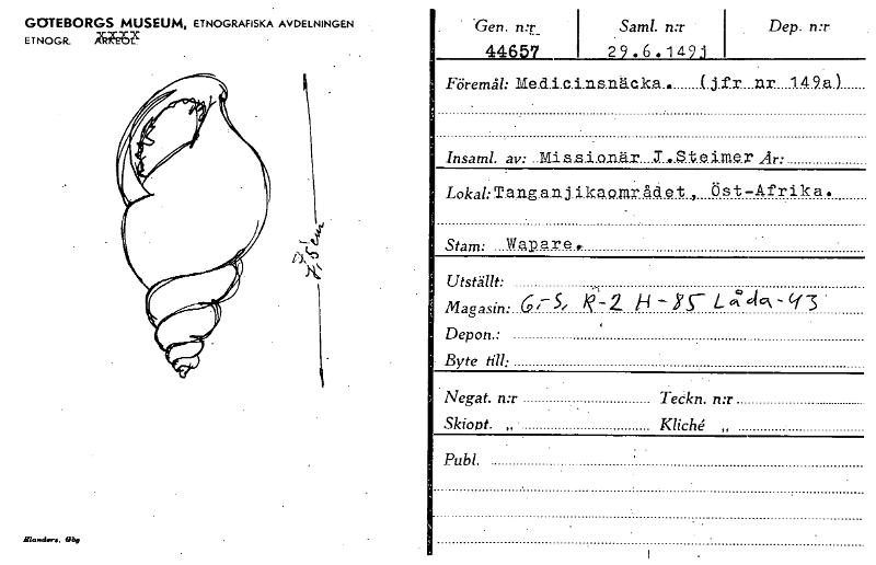 • GOTEBORGS MUSEUM, ETNOGRAFISKA AVDELNINGEN ETNOGR. .411rE •'Gen. n:r_ Samt. n:r Dep. n:r 44657 29.6.14.91 Föremål: Me.d.i.c.i.ns.n.å.cka, j.fr. .nr 1 49a.) Insaml. av: IV i szion.ä.r. . .i111Q.1" År: Lokab T.a.ng.anj.i.kaom,r åd e t Öst-Afrika. Stam: Wap are Utställt: Magasin:...' k-2 1-1-457S- L40\ (.-f 3 Depon.: Byte till: Negat. n:r Teckn. n:r Skiopt. „ Kliché„ Pub 1. ~odon', Giv [ocr]