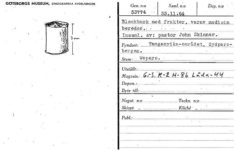 GOTEBORGS MUSEUM, ETNOGRAFISKA AVDELNINGEN Gen. n:o 53774 Saml. 33.11 '.'64 Dep. mo Bleckburk med frukter, varav medicin_ beredcS. - - Insaml. av: pastor John Skinner. Fyndort: Tanganyika-området, Sydpare- bergen. stam• Wapare. Utställt' Magasin: 61-.5, ke- H .R Depon. • Byte till: Negat. n:o Teckn. n:o Skiopt. „ Kliche „ [ocr]