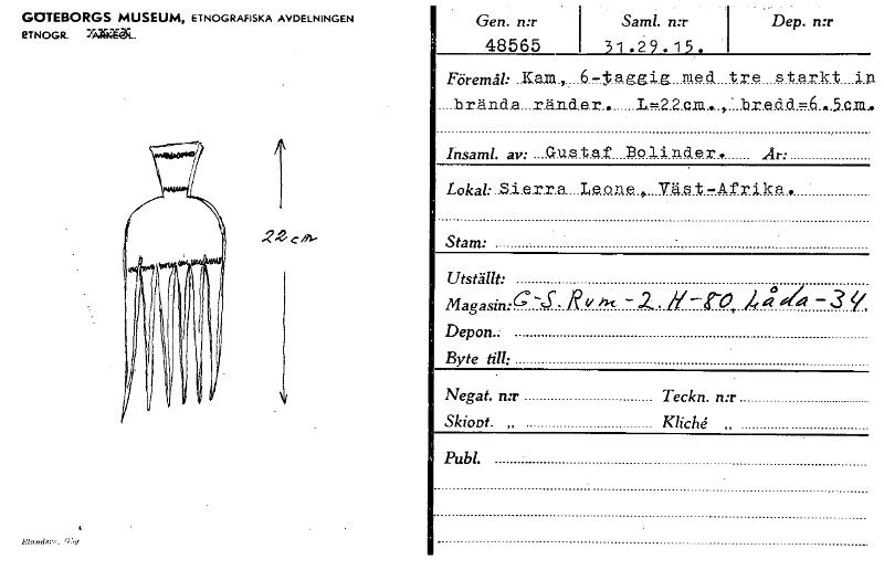 • GOTEBORGS MUSEUM, ETNOGRAFISKA AVDELNINGEN ETNOGR. VAXIgg_. Gen. n:r 48565 Saml. n:r 31.29.15. • Dep. n:r Föremål: _Kam, 6-taggig med tre starkt j4 b ränd.a. ..r.ä.n.d.e.r.. .L.,-.2.2.e.m....,....:br.e.dd..6...5.e_m Insaml. av: Gustaf Bolind, År: Lokab..S.i.e.r.r.a...1,2a.e., .:Srä.P t -Afrika . Stam: Utställt: Magasin:C --S . le n't - 2., il - to, Depon.- Byte till: Negat. n:r Teckn. n:r S... Visa hela
