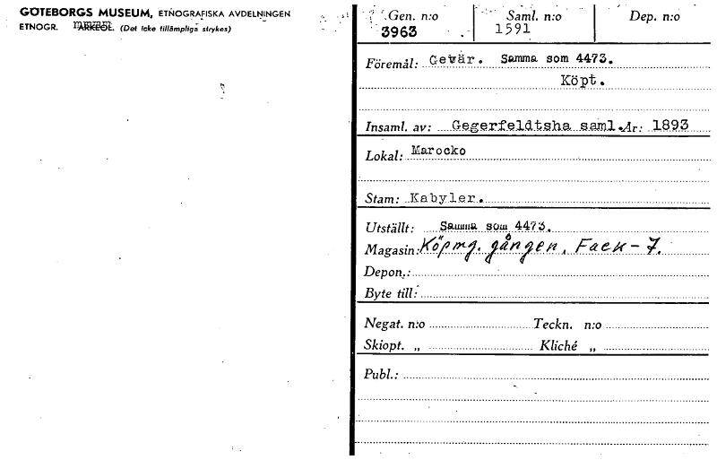 • GOTEBORGS MUSEUM, ETNOGRAFISKA AVDELNINGEN ETNOGR. 1.12~54. (Det icke iiIIåmpIig strykes) r.Gen. n:o • • 3963 • 1 - ' Sam!. n:o Dep. n:o1591 Föremål: Getår. Samma som 4475. Köpt. Insaml. av: aegerf.eldtBha sain.1.21r: 1893 Lokal: Marocko Stam: Utställt: Samma soul 447-3 MagasinP °film"' eloi i e Fa - X • Depon.: Byte till: Negat. n:o Teckn. n:o Skiopt. „ Kliché „ Publ. • [ocr]