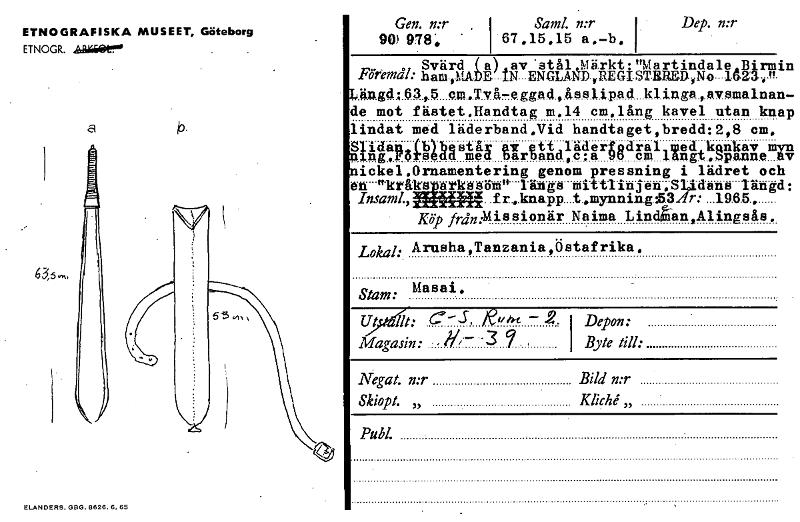 a fr 63,5 Gen. n:r 9O978 . i Sand. n:r 67.15.15 a.-b. I Dep. n:r Svärd f)a)_.av 'stål .Märkt:"Martindale,Birm Fkernåh hamTMA E...IN-ENGLAND,REGISTERED0No..-1623- " i ängd: 63,6 cm.Tv-eggad,å.sslipad klinga.„av.smalna: de mot fästet.liandtag m.14 cm.lång kavel utan kn lindat med läderband.Vid handtaget,bredd:2,8 cm. Slidan_(b)består av ett läderfodral med konkav m i. ing..rörsena niece. naroand,c:a go cm langt.panne...: ii ickel.Ornamentering genom pressning i lädret oc: en "kråka taTkoäöm" länga mittlinjen.SLidans Ung Insaml.,:n:-:,..:t.:..fr...kna.p.p...t...mynnin.g:5.3Ar: _19.6.5.. Köp från:Missionär Naima Lindan,A1ingsås. Lokal: Arnsha,Tanzania,Östafrika. Maska.. Stam: Mas Ut It: e-- S . le‘lh -2. Magasin: - -3 . , I Depon: I Byte till: Negat. n:r Bild n:r Skiopt. „ Kliché,, Publ. • . , ELANDERS. GBG. 8826.6.65 in ap ETNOGRAFISKA MUSEET, Göteborg ETNOGR. .4.614G~ [ocr]
