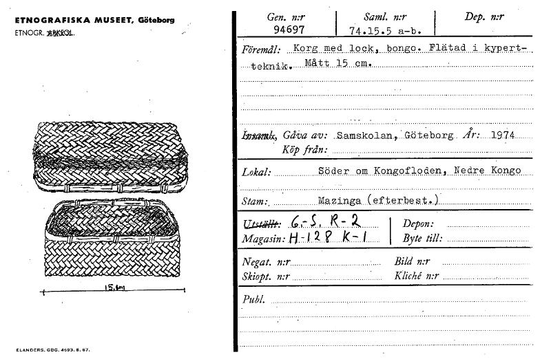 Gen. n:r 94697 ISaml. MT 74.15.5 a-b. Dep. n:r ETNOGRAFISKA MUSEET, Göteborg ETNOGR. Isktked_. 15,trn Föremål: Korg med lock, bongo. Flätad i kypert- teknik. Mått 15 cm. Gåva av: ..S.ams.kolan j v.r: 1974 Köp från:, Lokal: Stam:. Söder om Kongofloden„ Nedre Kongo Mazinga (efterbe ) matt• 6 5 , K - Depon: Magasin: H-I 2 ? k- 1 I Byte till: Negat. n:r Bild n:r Skiopt. n:r Kliché n:r Publ....