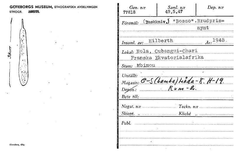 • GOTEBORGS MUSEUM, ETNOGRAFISKA AVDELNINGEN ETNOGR. 20111213L Gen. n:r 77818 Saml. n:r 49.5.47 Dep. n:r Föremål: (Buskimiv. "Bosson Brud pris= mynt Insaml. av: Hilberth Ar:1948 - Lokal: sola, Oubangui-chari Franska Ekvatorialafrika Stam: Tgb imou Utställt: Magasin: 6,--sa 4 4;4 /7 De n • it k hit - 4, Byte till: Negat. n:r Teckn. n:r Skiopt. „ Kliche Publ. ~m46% [ocr]