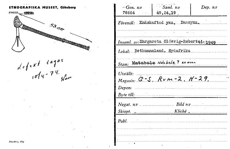• ETNOGRAFISKA MUSEET, Göteborg . ETNOGR. ie./c 1*-7“ gl Gen. n:r Sam i . mr 78664 49.24.19 Föremål: ...Kra5kaftad..yxa.• Dansyza. Insaml. av:Margareta 01devig-RobertsAr:1949 Lokal: Bethuanaland, Sydafrika matrab.ea-e. Alde.kede? ge Stam: Utställt.: , ° Magasin: C-4 , V d1.1 H 29, - D ep o n: Byte till: Negat. n:r Bild n:r Skiopt. „ Publ. Dep. n:r A Elcanders, Gbg [ocr]
