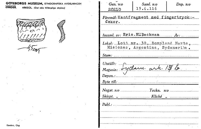 GOTEBORGS MUSEUM, ETNOGRAFISKA AVDELNINGEN :5745Eli. ARKEOL. (Det icke tillämpliga strykes) Elanders, Gbg . . Gen.-n:o 2,021.0 1 Saml. n:o . 19.6.116 Dep. n:o Föremål: crekor. Eric „EV.T.packman Insaml. av: Är: Lokal: ....Lott ..nr . - 30 , .13.o.r.nrilnr.c1 No.rte.,. Misione.s, Argentina, Sydamerika . Stam: Utställt: n • A'y 6' 64/'"Å"' / •Magasin: Vi Depon.• Byte till: Negat. n:o Teckn. n:o Skiopt. „ Kliché „ Påg: [ocr]