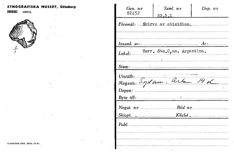 • ETNOGRAFISKA MUSEET, Göteborg NOW ARKEOL Negat. n:r Bild n:r Skiopt. „ Publ. ELANDERS. GBG. 9870. 10.51. Gen. n:r 82452 53.5_1 _n:r Dep. n.r Föremål: Skärva .av. obtsidian. Insaml. av • Ar • Lokal: Stam: Terr. Sta.Cruz, Argentina. Utställt: Magasin: pon: Byte till: [ocr]