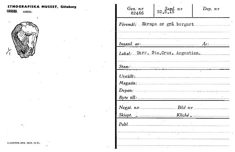 • Gen. n:r I 53,fg n:r Dep. n•r82466 Föremål i Sk.r AP a av .151"rå be.rgart Insaml. av• Ar• ETNOGRAFISKA MUSEET, Göteborg läglffl. ARKEOL. Utställt: Magasin: Depon: • Byte till: ELANDtRS. GBG. 3870. 10.51. Lokal: Terr. Sta.Cruz Argentina. Stam: Negat. n:r Bild n:r Skiopt. „ Publ. [ocr]