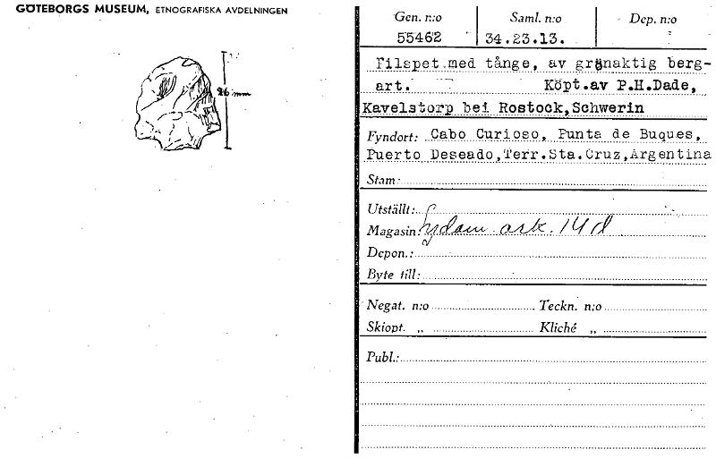 • GOTEBORGS MUSEUM, ETNOGRAFISKA AVDELNINGEN Gen. r.:o 5'546'2 Saml. n:o 34.23.13. Dep. n:o rilspet_med tånge, av grönaktig berg- art. Köpt.av Kavelstorp bel Rostock,Schwerin Fyndort: Cabo Curioso, Plints de Buques, Puerto Deseado,Terr.Sta.Cruz,Argentina Stam • Utställt' Magasin. Depon.: Byte till: Negat. n:o Teckn. n:o Skiont. „ KlicH „ Publ • [ocr]
