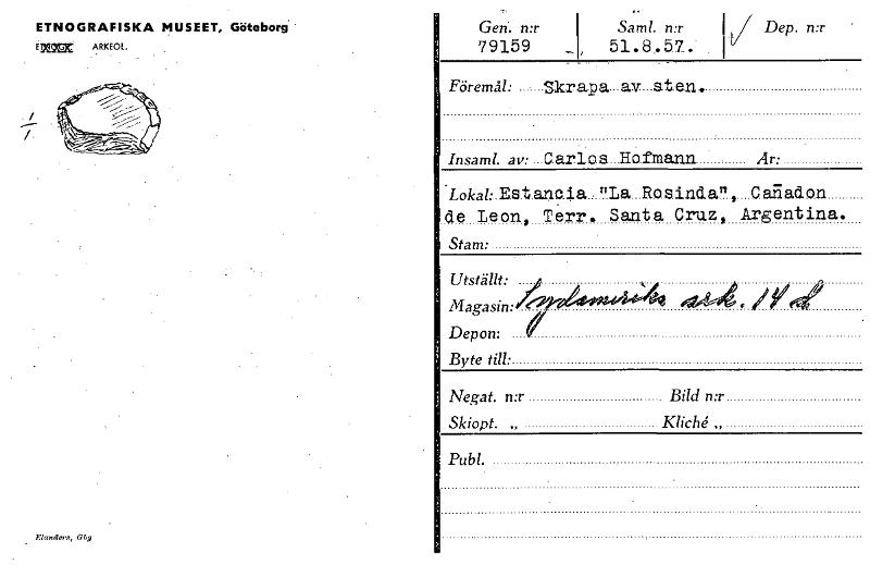 • Gen.. n:r Saml. n:r 79159 ..,., 51.8.51; Dep. n:r ETNOGRAFISKA MUSEET, Göteborg Ex= ARKEOL. Föremål: Skrapa. av sten. Insaml. av: Carlos...Harma= Är: Lokal: Est alle 3.a "La Rosinda7, Cariaclon de Leon, Terr. Santa Cruz, Argentina. Stam: Utställt: Magasin: Depon: Byte till: e-4-4~4444:448 Negat. n:r Bild n:r Skiopt. Kliche „ Publ. Ehmlers, Obg [ocr]