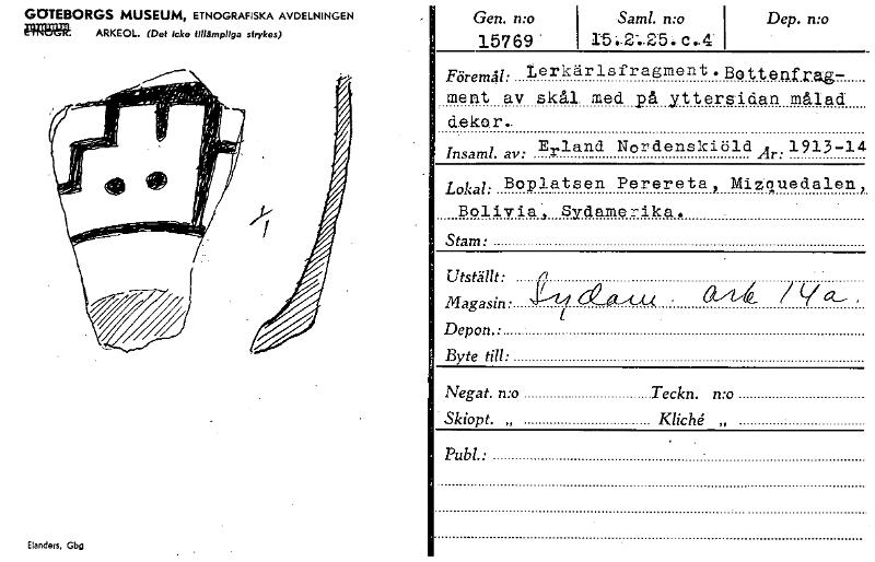 GOTEBORGS MUSEUM, ETNOGRAFISKA AVDELNINGEN ifflaTik ARKEOL. (Det Icke fillårnplfga sfrykes) Flandern, Gbg Gen. n:o 15769' Saml. mo I 15:2-.25..c..4" Dep. n:o r Föremål: Lerkärlafragment.Botten zag- ment av skål. med på yttersidan målad dekor.. Isam Erland NordenskiöldAr.1913-14 n l. av: Lokal: Boplatsen Perereta, Mitquedalen, Bolivia, Sydamerika. Stam: Utställt: Magasin: 1 Cea.U.0 . a74 / V C...