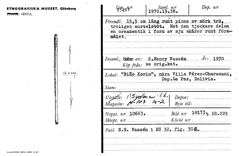 g546Yr 1970 19.38 Saml. n:r. Dep. n:r ETNOGRAFISKA MUSEET, Göteborg ~R. ARKEOL. ./ Föremdk 15,5 cm_långuAt_pinne av mörk trä, troligen mortelstöt.. Möt den tjockare delen en ornamentik i form av sju skåror runt före" mäIst. Insaml., ezitez av: Was.sån År: 1970 Köp från: • se orig.kat. Lokal: "Niiio Korin"`, nära Villa Pårez-Charasanip Dep.La Paz, Bolivia. Stam: U.y,s di: i' 75),044, Depon: Magasin: /9" /67 3 k "- Byte till: Negat. n:r 10663. Bild n:r 18173. Skiopt. n:r Kliché n:r Publ. S.H. Wassdn i ES 32, fig. 308, j 17.,5 t ti? . ELANDERS. GE3G. 4693.5.67. [ocr]