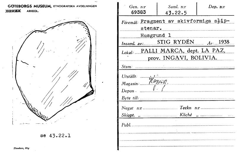• Elanders, Obg GÖTEBORGS MUSEUM, ETNOGRAFISKA AVDELNINGEN IK ARKEOL. Gen. n:r 69383 Saml. n:r 43 . 22 . 5 Dep. n:r Föremål: Fragment av skivformiga stlp- stenar. Husgrund 1 Insaml. av• STIG RYDÉN År: 1938 Lokal: PALLI MARCA, dept. LA PAZ, prov. INGAVI, BOLIVIA. Stam: 7 r; 'Vefat n:r Teckn n:r Skiopt. „ „ Publ.. Utställt: Magasin: Depon Byte till: se 43.22.1 [ocr]