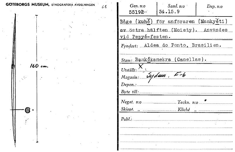 • Gen. n:o Sam!. n:o - Dep. n:o 5519g--; 34 . 15 . 9 Båge (kul) för anföraren (Mamki6ti) av_dstra_hälften_aaLatyl, ... _Användes vid 2epY6—festen. Fyndort: Aldea do Pont°, Brasilien. Stam • Rqmkökame... Visa hela