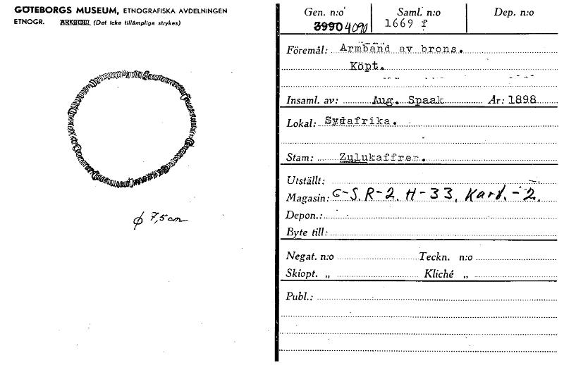 • GMEBORGS MUSEUM, ETNOGRAFISKA AVDELNINGEN ETNOGR. BRUM (Det Icke tillämpliga strykas) Gen. n:o Sam!. mo avjo ifoc:»1 1669 Dep. n:o Föremål: Arm-gänd av brons. Köpt. Insaml. av: Aug. Spaak Är: 189.8 ... Visa hela