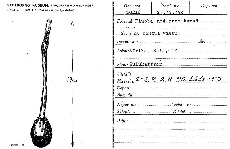 • GCITEBORGS MUSEUM, ETNOGRAFISKA AVDELNINGEN ETNOGR. KOCE:CIX (Det icke tillämpliga strykes) Elanders, Gbg Gen. n:o 30212 1 >Sam. n:o 25.17.174 Dep. n:o . Föremål: Klub.b.a....me.d....runt...h.u.v ud .... Visa hela