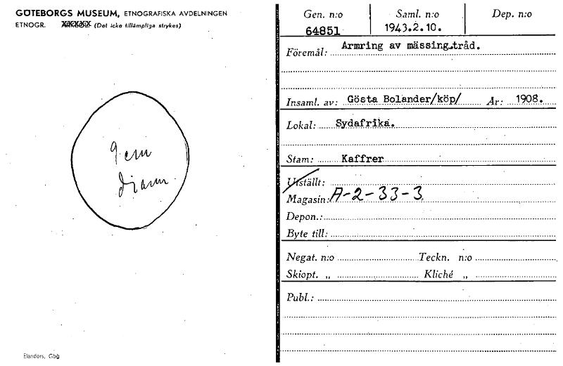 GOTEBORGS MUSEUM, ETNOGRAFISKA AVDELNINGEN ETNOGR. man (Det icke fillåmpliga strykes) Elanders, Gbd Gen. n:o 64851- Sam!. n:o 1943.2.10. Dep. mo Armring av mässing..tråd. Föremål: , Insaml. av: Gösta...