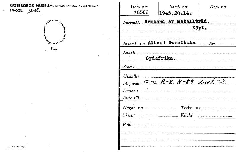 • GC1TEBORGS MUSEUM, ETNOGRAFISKA AVDELNINGEN ETNOGR. OL. Elmaers, Gbg Gen. n:r 76528 :1945.20.14. Samt. tur Dep. n:r Föremål: Armband av metalltråd. Köpt. Insaml. av • Albert Gornitzka Ar. Lokal: Sy... Visa hela
