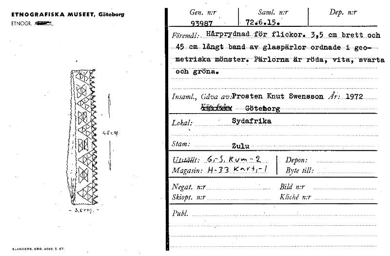 ETNOGRAFISKA MUSEET, Göteborg ETNOGR. MERECt. 4Sc - Gen. n:r I Sand. n:r Dep. n:r 93987 I, 7246.15. Föremål: , Hårprydnad. för flickor. 3,5 em brQtt och 45 cm långt band av glaspärlor ordnade i gea- • metriska mönster. Pärlorna är röda, vita, svarta och gröna. InsaraL, Gåva av:Prosten Knut Swensson. .1972 SäkiliX Göteborg Sydafrika Ets,täät: 64-5, k - I Depon: Magasin: H-33 K`^vir- i I Byte till: Negat. n:r Bild n:r Skiopt. n:r Kliché n:r Pub!. Lokal: Stam: Zulu ELANDERS. GBG. 4693. 5.67. [ocr]
