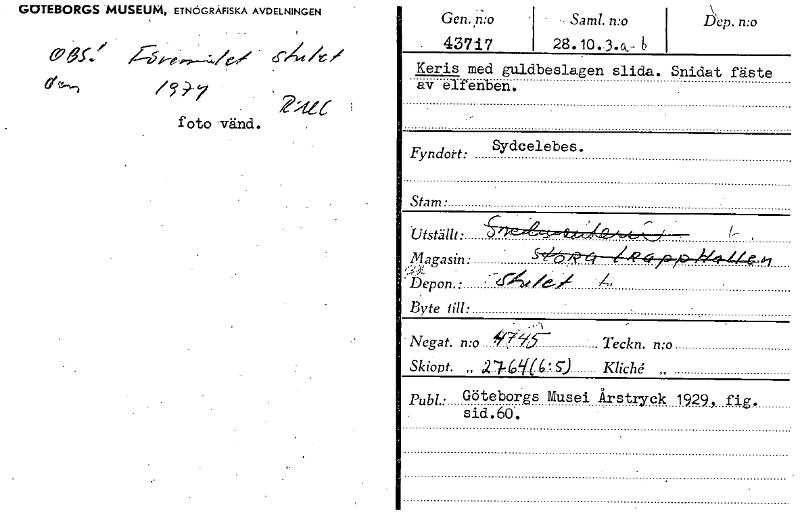 • GOTEBORGS MUSEUM, ETNCSGRAFISKA AVDELNINGEN ?-7 foto vänd. Gen. ,r;:o 43717 • Sam!. n:o t> Dep. n:o Keris med guldbeslagen slida. Snidat fäste av elfenben. Fyndort: Sydcelebes. Stam • Utställt. • Mag... Visa hela