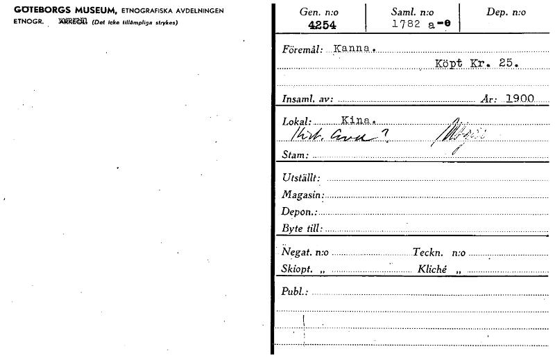 • GOTEBORGS MUSEUM, ETNOGRAFISKA AVDELNINGEN ETNOGR. ~B (Det leka tillämpliga strykas) Gen. n:o 4254 Sam!. n:o 1782 a Dep. n:o Föremål: Kanna . Köpt Kr. 25. Insaml. av: Är: .1900 Lokal: Kina. /4 Stam:... Visa hela