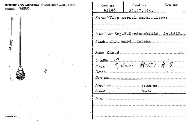 • GOTEBORGS MUSEUM, ETNOGRAFISKA AVDELNINGEN ETNOGR. XiRgdg Gen. n:r 41145 Saml. n:r 2'7.2'7.174. Dep. n:r Föremål: Vi.s.p...marme.d....c.a.c.a.o....v.is.pas •Insaml. av: .Exp.E.Nordenskiäld Ar: 1927 Lo... Visa hela