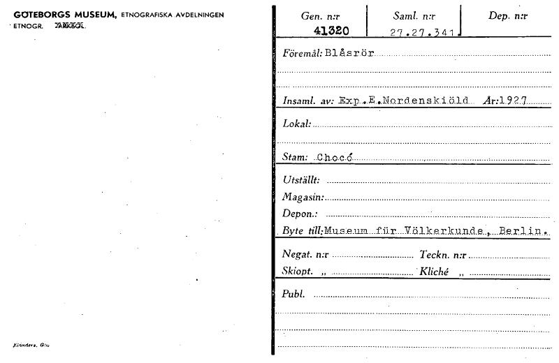 • GOTEBORGS MUSEUM, ETNOGRAFISKA AVDELNINGEN ET NOGR. nfigega. Gen. n:r 41320 Saml. n:r 27.27.341.1 Dep. n:r Föremål: Bl.å.sr.ör Insaml. av: Exp... E .Nord.enslc Ar:1.92 7 Lokal: Stam: __C.h-o-c4 Utstä... Visa hela