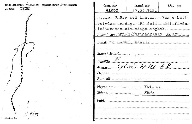 GOTEBORGS MUSEUM, ETNOGRAFISKA AVDELNINGEN ETNOGR. ÅKr4gÖLT Ainnders. G.7(1 , Gen. n:r 41350 Samt. n:r 27.27 Dep. n:r Föremål: Snöre med knutar. Varje knut ...b.e.tyd.e.r e.r ..d.a,0:.. På.. &etta sä...