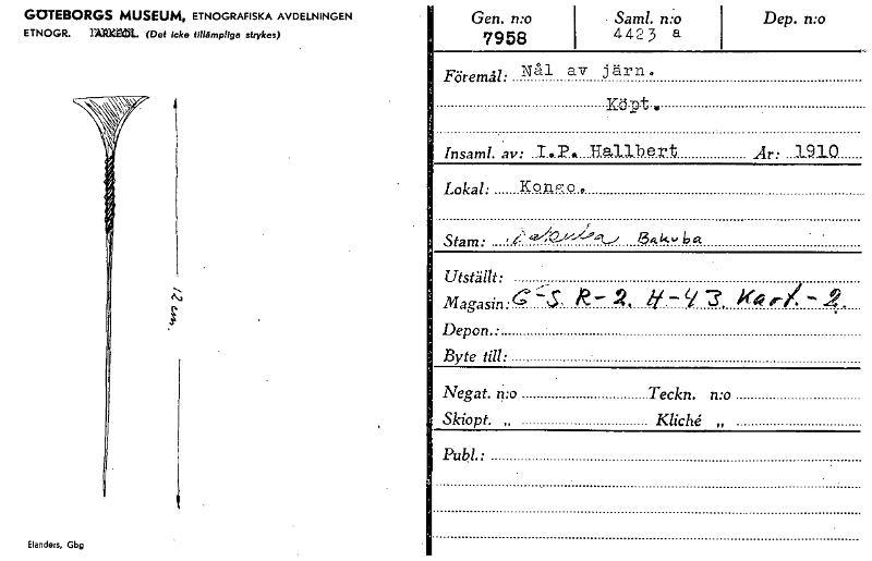 GOTEBORGS MUSEUM, ETNOGRAFISKA AVDELNINGEN ETNOGR. 1i12a.. (Det icke tillämpliga strykas) Elanders, Gbg Gen. n:o 7958 1 Sam!. n:o 4423 a Dep. mo Föremål: Nål av järn. Köpt.. Insaml. av: _1,2, Hallber...