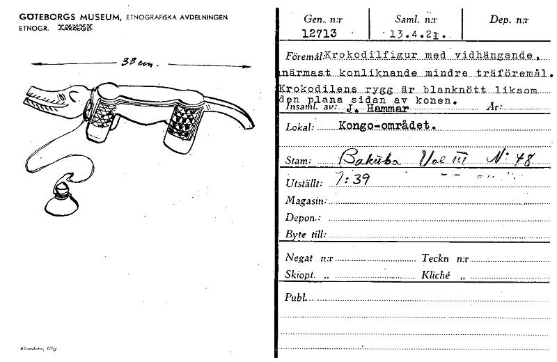 GOTEBORGS MUSEUM, ETNOGRAFISKA AVDELNINGEN ETNOGR. XakeEZZ ^Inder,,Gbg Gen.. n:r ' 12713 - Sam!. mr .13.4.21.. Dep. mr Föremg:Krokodislfigur med vidhängande, ,närmast_konli.knam.d_nindrnä.färamål, latQXPPIA1.euu_rygg_är branknhtt liksnm • Ynlisan12-åvn:a. je.i.cilia n .av konen. Är: Lokal:. Kongo—området. Stam• a-kii:-4_ --, .e kee(- XI' , -- Utställt: .39 . . Magasin: • Depon.: • Byte till: ••Negat mr Teckn n:r Skiopt. „ Kliché „ Publ.. ' - - - [ocr]