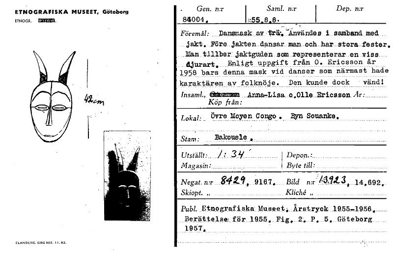 ETNOGRAFISKA MUSEET, Göteborg ETNOGR. Mena ELANDERS. 060 502. 11. 53. . Gen. n:r Sam!. n:r 84004, im55„8„8. I Dep. n:r Föremål: Danemask av - trk "Invit nde a i sannband med. jakt,..Före..jakten..dansar...man..och..har...stora.fester Man.tillb.er „jaktgUele.n..som represe.nterar en .vis.s djurart.. Enligt uppgift från 0. Ericsson år ' 1958 bars denna mask vid danser som närmast had( karaktären av folknöje. Den kunde dock - vänd: Insaml., thmmmtvg AnnaTLisa..o.,011e...Eric s.s on. Ar: Köp från: Lokal: Övre Moyen Congo .. Byn Souanke. .Stam: Bakouele . Utställt: 1; 3 ii ' Magasin: Depon.: Byte till: • , Negat. n:r ....84 ### . 7, 916.7. Bild n:13411-3 i 14.6.92,. Skiopt. „ Kliché „ Pub!. Etnografiska_ Museet „..Årstryck...1955-19.56-. Berättelse: för 19.55.„..F.ig„...2,...P„...5.....G.öt.eberg 1957, ,.. [ocr]