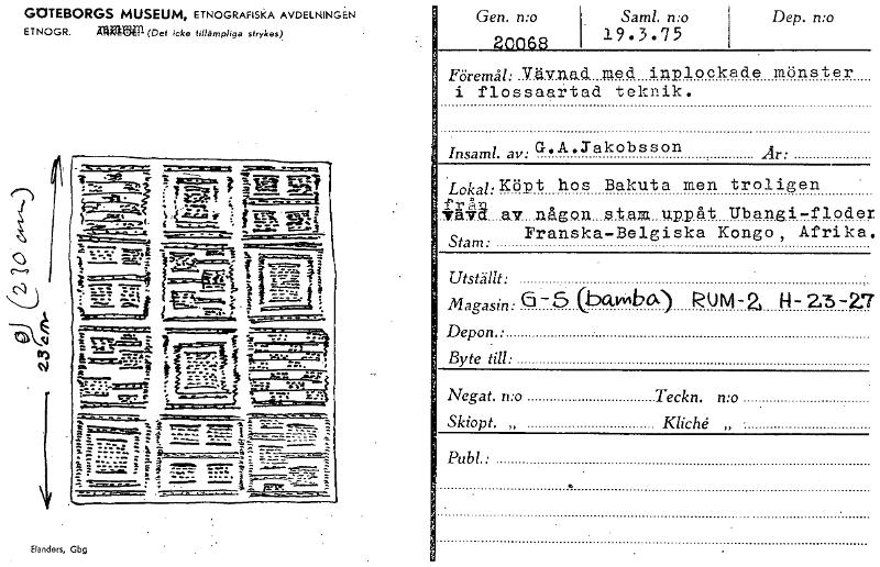 GOTEBORGS MUSEUM, ETNOGRAFISKA AVDELNINGEN ETNOGR. ~.1- (Det icke tillämpliga strykas) Gen. n:o 2006E3 Saml. n:o 19.3.75 Dep. mo Föremåh.VäKnad med inplockade mönster i flossaartad teknik. Insaml. av....