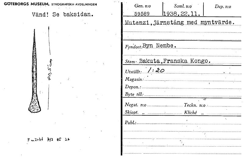 Gen. n:o Sam!, mo. Dep. n:o 59589 1938.22.11. “Mutenzi,järnstäng med uarntvärde. GOTEBORGS MUSEUM, ETNOGRAFISKA-AVDELNINGEN Vänd! Se baksidan. Fyndort:Byn N embe. stam: Bakuta,Franska Kongo. ,Utställ...