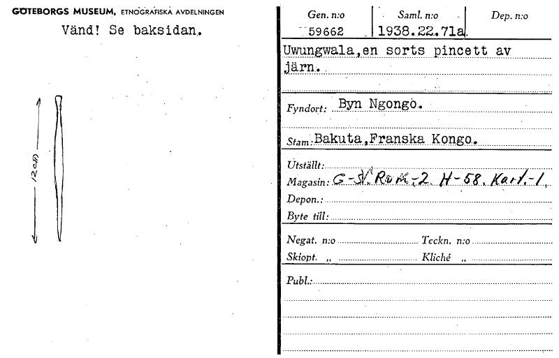 Gen. n:o Sargruo j IND. wo -:59662 11938.22,.71 , Uwungwalalen sorts pincett av järn. GOTEBORGS MUSEUM, ETNOGRAFISKA AVDELNINGEN Vänd! Se baksidan. • Fyndort: Byn Ngongö. stam.Bakuta,Franska Kongo. U...