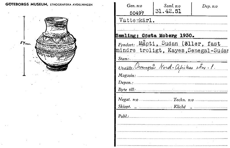 GOTEBORGS MUSEUM, ETNOGRAFISKA AVDELNINGEN Gen. n:o Sam!. n:o 5049-7 31.42.51 Dep. n:o Vattenkärl. Ening: Gösta Moberg 1930. Fyndort: Mkti, Sudan (äller, fast mindre troligt, Kayes,Senegal-Sudar Sta...