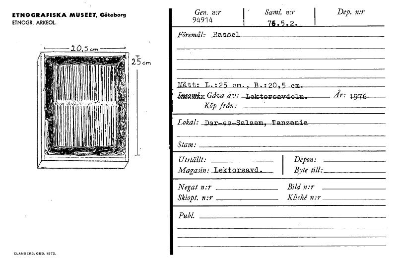 • ETNOGRAFISKA MUSEET, Göteborg ETNOGR. ARKEOL. 10 GM ELAND ERS. GBB. 1972. Gen. n:r 94914 Saml. n:r 76.5.2.i Dep. n:r Föremål. Rassel u : •e a amtkc Gåva av: Loktoreavdcln. ÅT • 1976 Köp från• Lokal. D... Visa hela